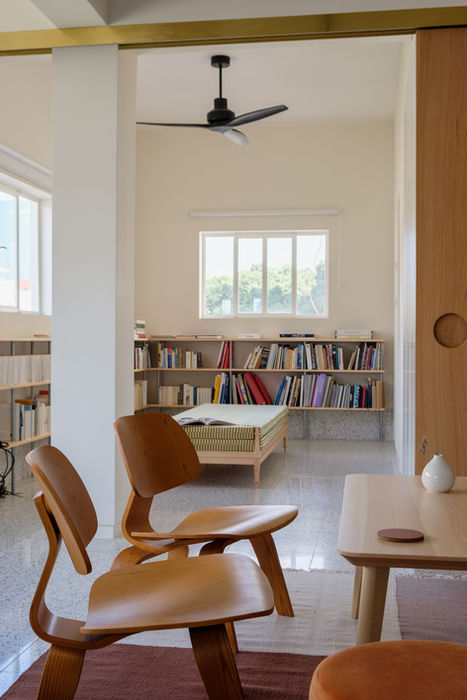 פעמים רבות בשלב הלבשת הבית הרהיטים של הסטודיו מתאימים אך לא מדוייקים למידות ולצרכים של הלקוח, ודורשים התאמות ושינויים קלים. כך, במחשבה משותפת, התאמנו את הרהיטים לבית ברחוב לטריס: את ספריית נינה הרחבנו כדי לאפשר לדיירי הבית לאחסן בה את התקליטים שלהם. את ספסל אוזניים התאמנו למידות הנכונות לו כספסל כניסה לבית. ספסל H, שממוקם במטבח, הותאם לשולחן האוכל כך שיחסוך מקום יקר.